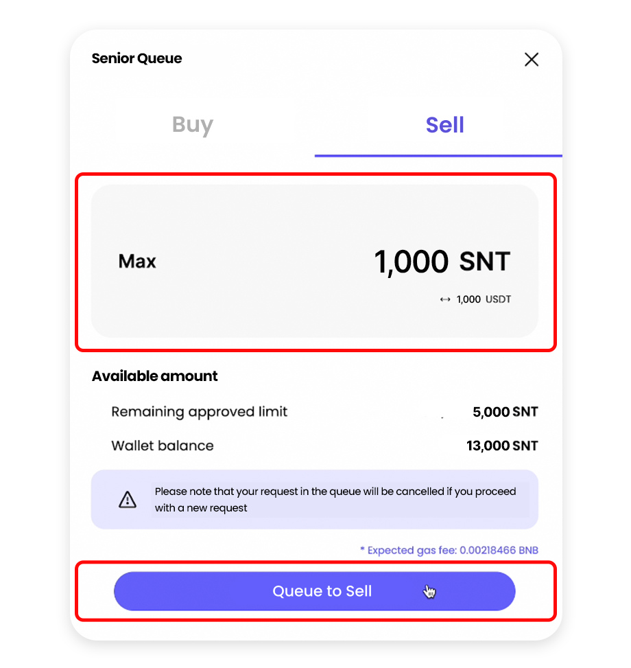 3\.  시니어 대기열(Senior Queue) 팝업창의 판매(Sell) 탭에서 판매할 SNT 토큰의 수량을 입력합니다. 최대 판매 대기 금액은 SNT의 min\[판매하고자 하는 수량, (승인한도-사용수량)]입니다. (소수점은 BSC의 경우 16자리까지, Klaytn의 경우 6자리까지 입력 가능합니다.)
