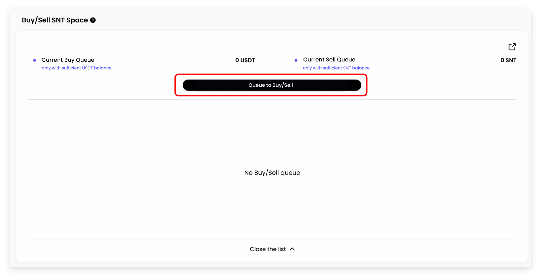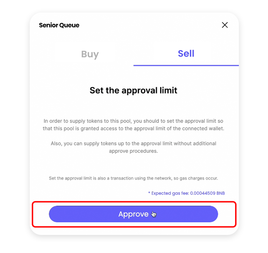 1. 펀딩 또는 라이브 상태에서 구매/판매 대기열(Queue to Buy/Sell) 버튼은 활성화되고 풀이 닫히면 비활성화 됩니다. 활성화된 버튼을 클릭하면 2번의 팝업창이 열립니다. 현재 시니어 풀의 구매/판매 대기열만 열려 있습니다.