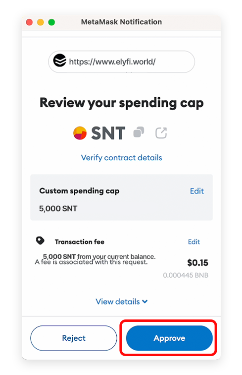 2. 판매 대기열(Sell queue)을 사용하기 위해서는 연결된 지갑에서 판매 대기열에 대한 승인 한도를 설정해야 합니다. 팝업창에서 승인(Approve) 버튼을 클릭하면 연결된 지갑에서 승인 한도 설정 팝업창이 활성화 됩니다. 승인한도를 직접 입력하거나 ELYFI에서 설정한 기본값 사용(Use Default) 버튼을 클릭하여 입력창에 승인한도를 입력합니다. 입력 후 다음(Next) 버튼을 클릭하면 최종 승인 팝업창으로 이동합니다. 승인한도를 확인한 후 승인(Approve) 버튼을 클릭하면 몇초 후 시니어 대기열(Senior Queue) 팝업창의 판매(Sell) 탭으로 전환됩니다.